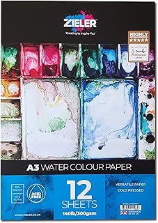 Zieler Aquarellpapier, feine Körnung, 300 g/m², 12 Blatt – ideal zum Einweichen und Maskieren. Hergestellt in Großbritannien. A3