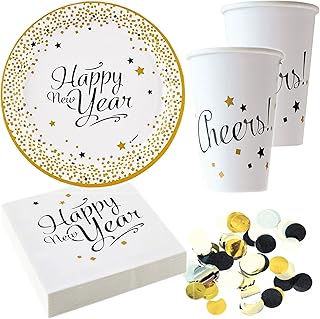 37-teiliges Partyset * Happy New Year * Silvester // für Silvesterparty Party // mit Teller + Becher + Servietten + Konfetti // Deko Gold Silber schwarz Frohes Neues Jahr Neujahr Neujahrsfeier