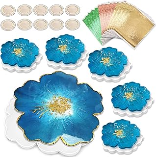 MBLAI Silikonformen Epoxidharz Untersetzer 6pcs, Epoxidharz Formen Set Harz Gießen Set, Blumen Formen für Epoxidharz UV Resin Art Achat Tassenmatten Formen mit 15pcs Goldfolie und 10pcs Fingerschutz