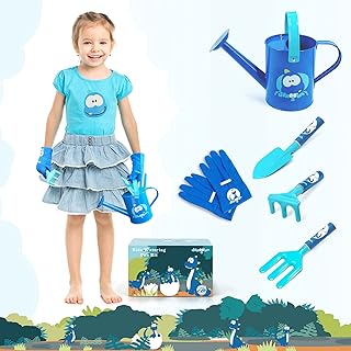 Colwelt Kinder-Garten-Set, 5-teilig, niedliche Metall-Gartenwerkzeuge für Kinder, inklusive Metall-Gießkanne, Holzgriff, Kelle, Gabel, Rechen, Handschuhe, Kinder-Gartengeräte (blau)
